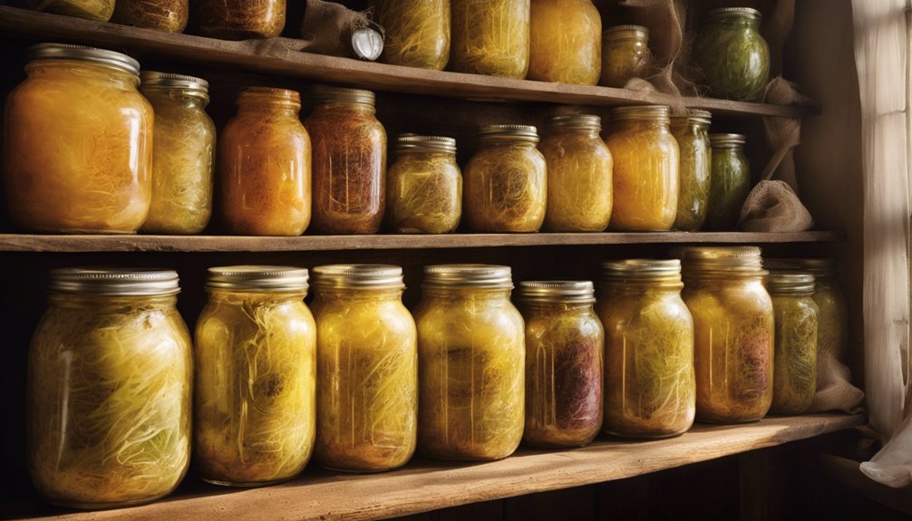 Aby skutecznie przechowywać swoją kiszoną kapustę, trzymaj ją zanurzoną w solance w szczelnym pojemniku. Słoiki szklane sprawdzają się najlepiej, zachowując świeżość przez okres do sześciu miesięcy w lodówce w temperaturze od 32°F do 40°F. W przypadku większych partii użyj pojemników z tworzywa sztucznego przeznaczonych do kontaktu z żywnością z szczelnymi pokrywkami. Jeśli chcesz wydłużyć czas przechowywania, rozważ zamrażanie porcji w opakowaniach próżniowych, które mogą przetrwać do ośmiu miesięcy. Zawsze sprawdzaj oznaki zepsucia, takie jak dziwne zapachy lub śliska tekstura i wyrzuć, jeśli to konieczne. Pamiętanie o tych wskazówkach pomoże Ci zachować ten pyszny smak, a jest jeszcze wiele do odkrycia na temat metod przechowywania!