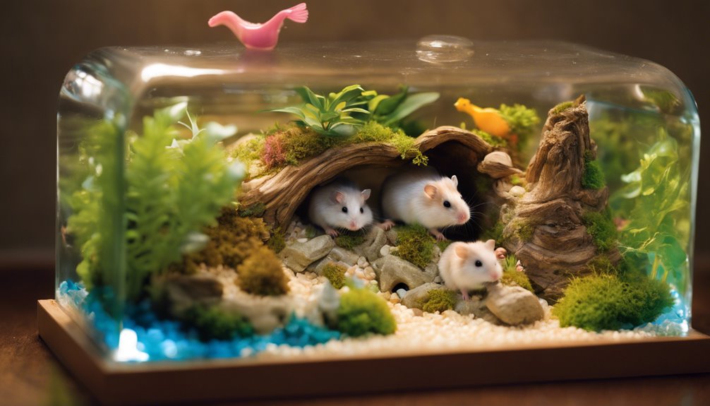 Organizowanie akwarium dla chomika nie jest idealne z powodu słabej wentylacji i ograniczonej przestrzeni. Zamiast tego, rozważ przestronną klatkę o powierzchni podłogi co najmniej 2000 cm² i wysokości 30 cm. Zapewnij wygodny domek do spania, koło do biegania dla ćwiczeń oraz bezpieczne, chłonne podłoże, aby zachęcić do kopania. Użyj ciężkich misek na jedzenie i wodę, aby zapobiec rozlaniu. Regularne czyszczenie jest kluczowe dla utrzymania zdrowego środowiska. Choć akwaria wydają się być alternatywą, odpowiednia klatka poprawia samopoczucie twojego pupila i interakcję z tobą. Jeśli jesteś ciekaw, jak stworzyć idealne siedlisko, jest jeszcze wiele do odkrycia.